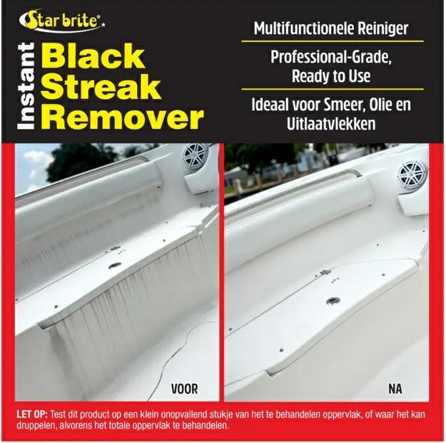 Zwarte Strepen Verwijderaar van Star brite begint te werken bij contact en is ideaal om zwarte strepen of vuil te verwijderen van polyester, vinyl, kunststof, RVS, rubber en geverfde oppervlakken.