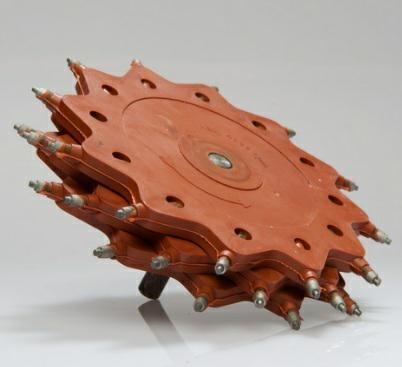 De roterende straler is voorzien van natuurrubberen schijven voorzien van 12 hardmetalen pennen. De pennen staan onder een bepaalde hoek ten opzichte van het midden waardoor deze door de centrifugale kracht naar buiten willen komen.