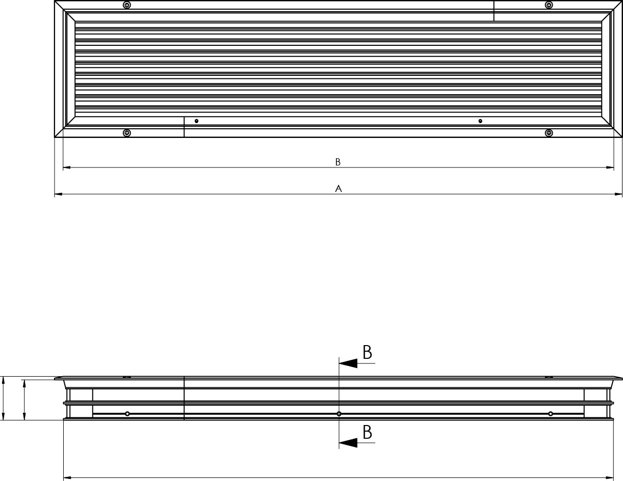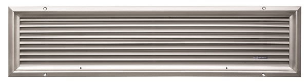 Rechthoekig ventilatierooster. Het frame is gemaakt van gepolijst geanodiseerd aluminium, het rooster is gemaakt van geanodiseerd aluminium.