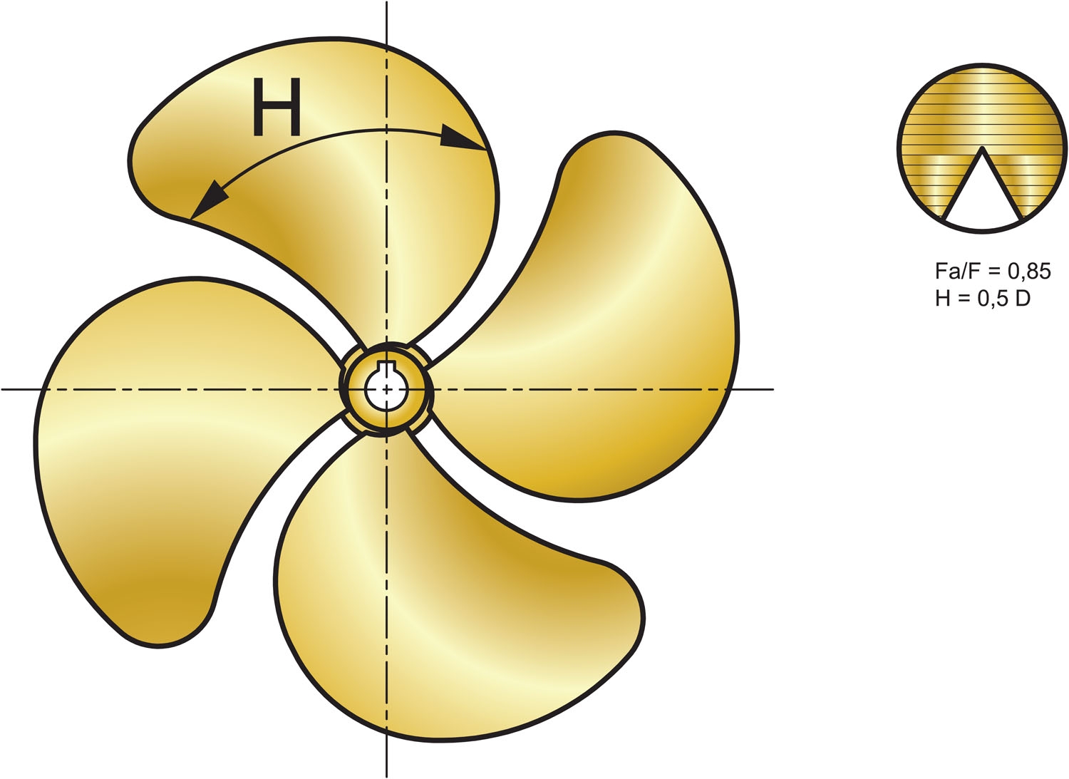 4-blads scheepsschroef van mangaanbrons. Schroefdiameter 17", spoed 21". Bladoppervlak Fa/F = 0.85. Met 35 mm asgat, conus 1:10.