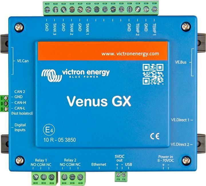 Venus GX is het communicatiecentrum van uw installatie. Met Venus GX kunt u alle componenten in uw systeem aanspreken en ervoor zorgen dat deze in harmonie met elkaar werken. De bewaking van live-gegevens en het wijzigen van instellingen vindt plaats op uw smartphone (of een ander apparaat) via ons gratis Victron Remote Management Portal.