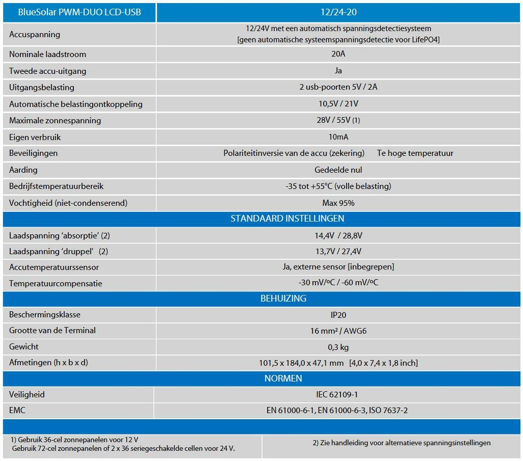 De BlueSolar PWM-laadregelaar (DUO) LCD&USB heeft de volgende kenmerken: